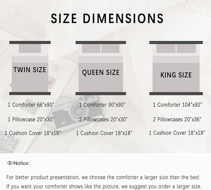 - King Size : 4 Pcs King Comforter Set includes one comforter measures 104x90 inches, two pillow cases measure 20x36 inches, and one decorative pillowcase measures 18x18 inches
