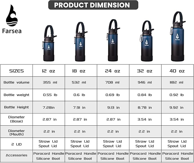 - WHAT YOU'LL GET: Farsea is committed to providing the best value and highest quality to the customers; We offer Continuous After-sales Service and Solve All Problems; We offer several different capacity bottles(12 oz, 18oz, 24 oz, 32 oz, 40oz) and you can choose according to your needs; Package: Comes with 2 lids (Straw lid & Spout Lid), paracord holder, protective Silicone Boot, nice packing box, 2 straws, and straw brush