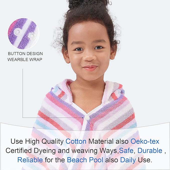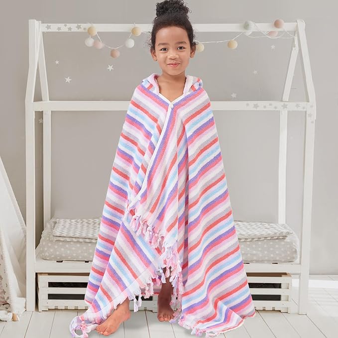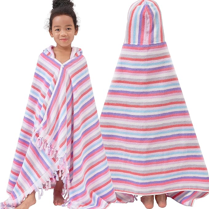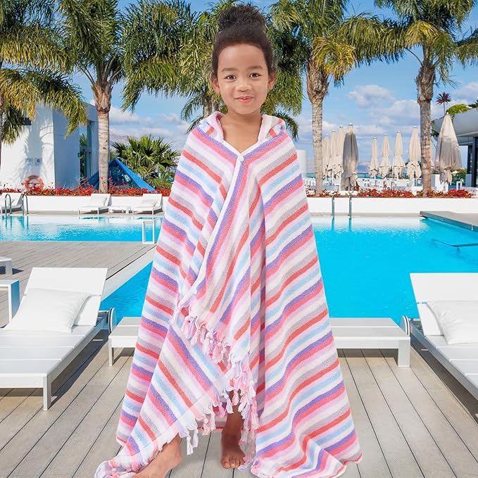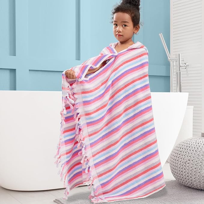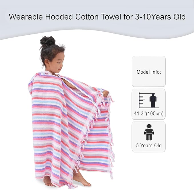Hooded Bath Towel for Kids (3-10Years) - Soft, Absorbent Oversized Turkish Cotton Pool Towels with Hood for Toddler,Perfect for Bath | Beach | Pool | Swim, Jacquard, Color Stripe with Tassels