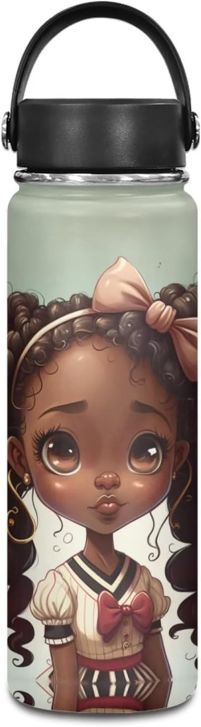 ZOUTAIRONG Black Afro Girl Insulated Water Bottle 18 oz Stainless Steel Sports Metal Water Flask African American Girls Water Cup Mug Reusable Water Bottle Jug for Daily Use, Travel, School