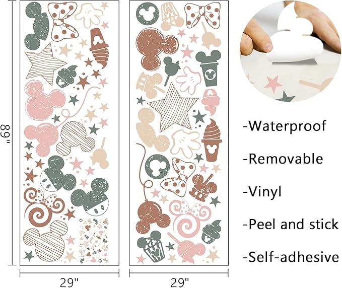 - Package Including: You will get 2 sheets of delicate cartoon mouse wall decals and murals in the package. The height of each removable vinyl wall decal is about 35 inches and the width is about 12 inches. Each pattern element can be arranged freely, which allows kids to use imagination and preference to create their own unique wall decor style. The bright colors and various patterns will greatly add a sweet and warm atmosphere to your boys or girls bedroom