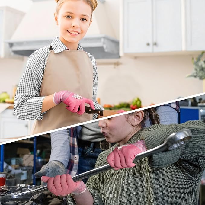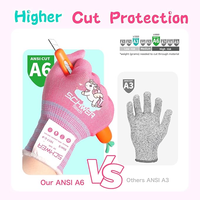 - 【ANSI A6 Cut Level】Kids' cut resistant gloves provide ANSI A6 cut resistance, maintaining the higher level of protection in its class. For kids, the cut resistance of kids cutting gloves can fully meet the hand protection they need in all work.