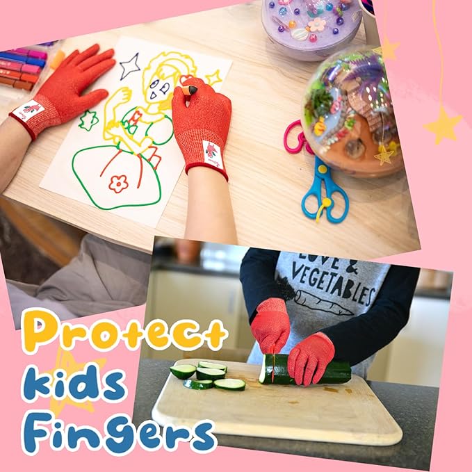 - 【2 Pairs 】2 pairs of kids gloves are easy to distinguish for use. One pair is placed in the kitchen, so that kids are free from knives and mandolin injuries. One pair protects kids to use hand tools safely. Kids cut proof gloves are also perfect for adults with small hands.