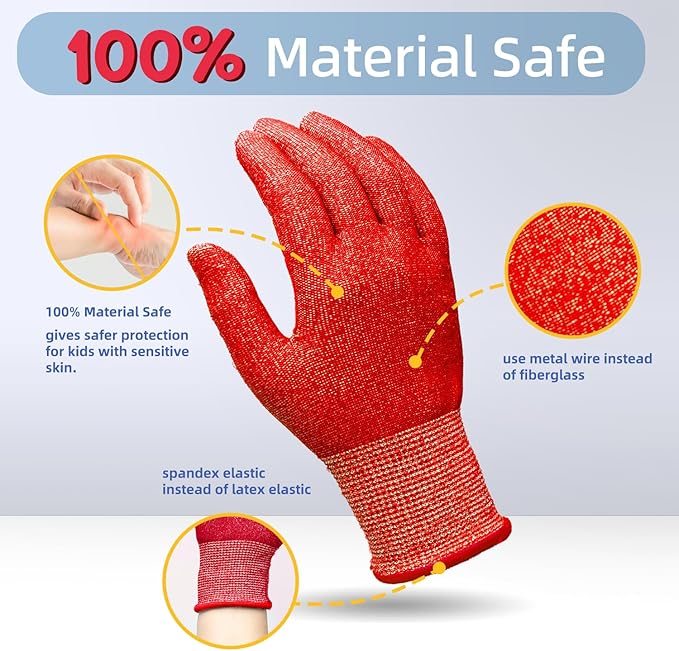 - 【100% Material Safe 】Compared with others, kids working gloves use metal wire instead of fiberglass, providing a cutting glove solution for kids whose skin and eyes are sensitive. In particular, we use spandex elastic at the wrist instead of the marketed wrists with latex elastic. Make it 100% worry-free for kids with sensitive skin!