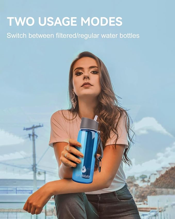 - 4-Stage Filtration - The Survimate water filter bottle adopts a composite filter technology, can reduce most contaminants. The filter element uses a coarse filter screen, a 0.01μm hollow fiber UF membrane, a sediment PP membrane and an activated carbon fiber to reduce chlorine, bad odor and intercept heavy metals, sediment, soil, organic matter and other impurities, etc.