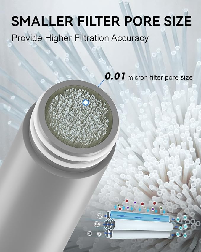 - Smaller Filter Pore Size - The filter pore size of the hollow fiber UF membrane is 0.01 microns so that it can filter out 99.99% harmful materials from the water while other brands' filter pore size is only 0.2 microns. The smaller filter pore size, the higher filtering accuracy.