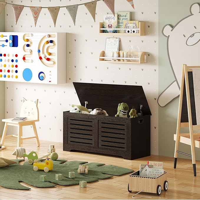 - 【Sturdy & Durable】The kids toy chest is made of safe engineered wood and superior craftsmanship. It is sturdy and durable to effectively prevent chemical reactions between the rubber staffs and the wood chest surface. Easy to wipe clean and upkeep. Your cost-effective choice
