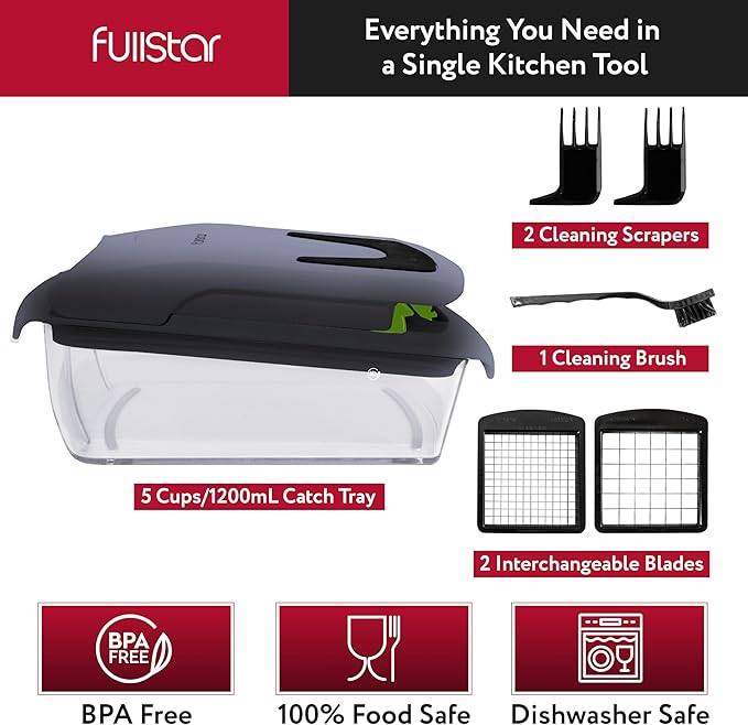 • The Viral Fullstar Vegetable Chopper - The Original Fullstar Veggie Chopper now comes with 2 interchangeable dicer blades! The built-in chop lid lets you cut foods directly into the 1.2L collection tray without the mess of a knife and cutting board. The storage container lets you hold prepared vegetables until you are ready to begin cooking.
