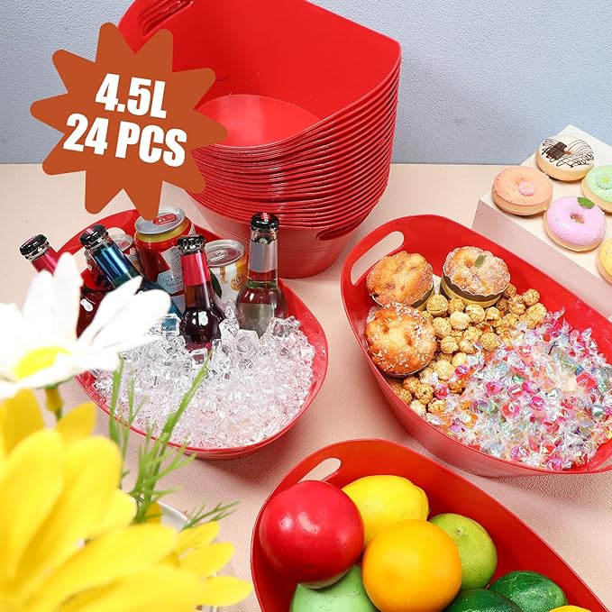 Norme 24 Pcs Oval Storage Tub with Handles, 4.5L Plastic Ice Bucket Wine Beer Champagne Bottle Drink Cooler Tub for Parties Beverage, Storage Basket (Red)