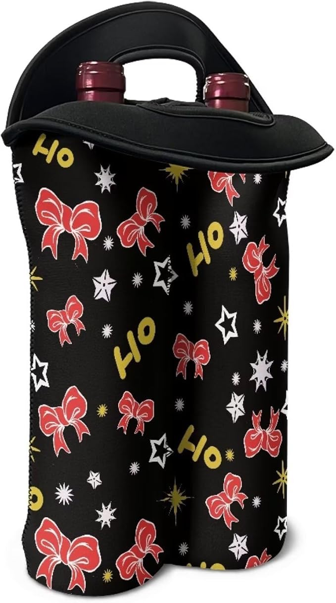 doginthehole Bowknot Print Wine Bag 2 Bottle Wine Tote Carrier Insulated Wine Cooler Bag for Travel Picnic Christmas Ho Ho Ho Portable Neoprene Wine Tote Holder Household Supplies Christmas Decor