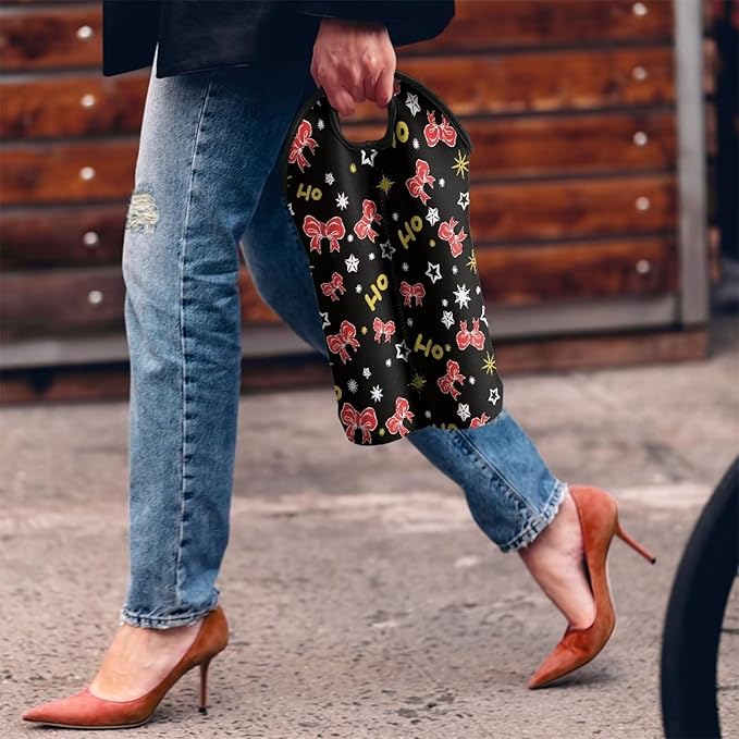 doginthehole Bowknot Print Wine Bag 2 Bottle Wine Tote Carrier Insulated Wine Cooler Bag for Travel Picnic Christmas Ho Ho Ho Portable Neoprene Wine Tote Holder Household Supplies Christmas Decor
