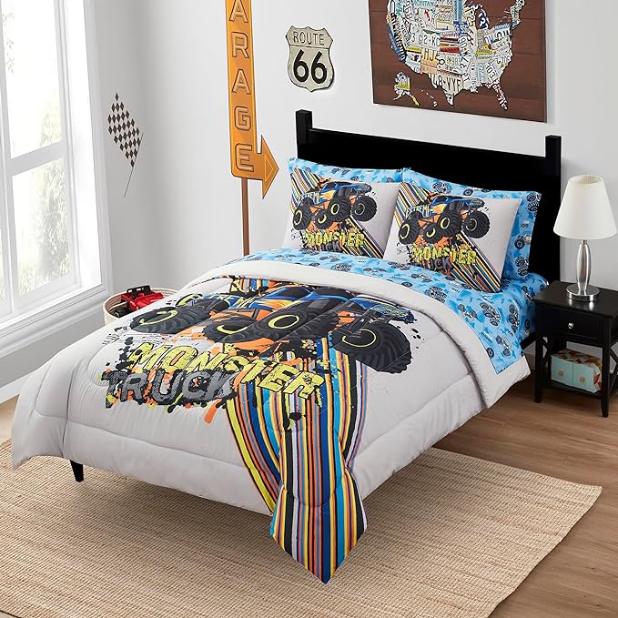 Kids Bedding Set Bed in a Bag for Boys and Girls Toddlers Printed Sheet Set and Comforter, Full, Monster Truck