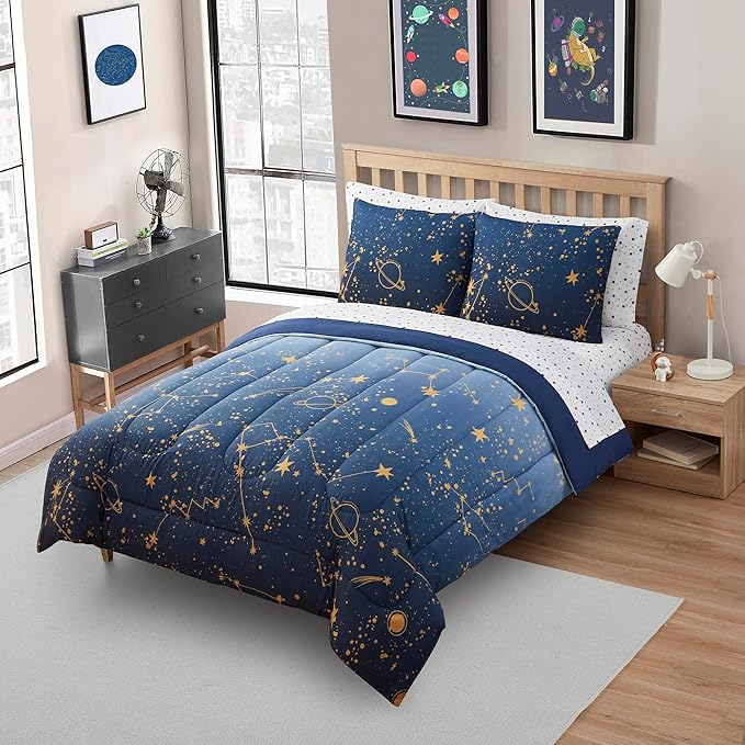 Kids Bedding Set Bed in a Bag for Boys and Girls Toddlers Printed Sheet Set and Comforter, Full, Galaxy