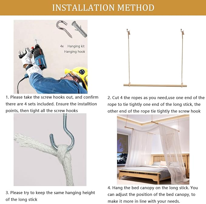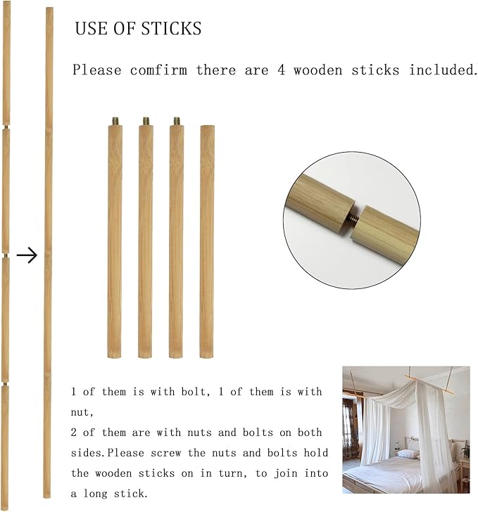 - Easy Setting Up Bed Canopy Curtains King Sized : This bed drapes canopy is quite easy to install! Assembling the Wooden Bed Pole(Wooden poles are equipped with threaded joints, no tools required),Then cut the hanging rope and just fix the bed pole to the ceiling. What you need to do is to simply put the canopy bed drape over the top of your canopy bed frame. Slope this king canopy curtains scarf more or less to adjust the drapery height that you need over the bed. If the scarf is a bit longer