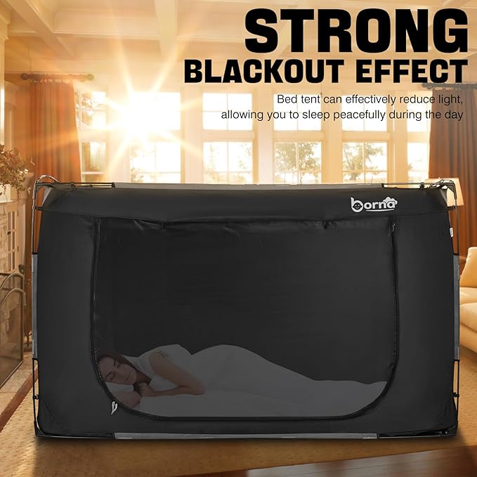 - 【RECTANGULAR PATENTED DESIGN】BORNA bed tent is designed with unique inserted poles, compared to pop-up tents on the market, we use 9.5mm fiber poles to create this through pole blackout tent, which won't collapse or bend, making it more stable and durable. The rectangular frame structure is also very spacious, making it an ideal choice for you.
