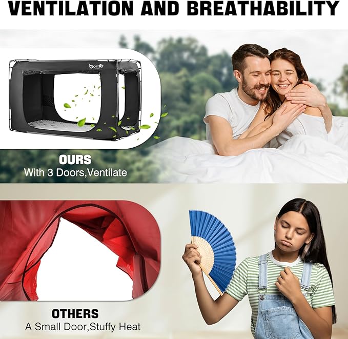 - EASY ACCESS-3 DOORS: This bed tent twin has 3 spacious large doors with double zippers that can be opened or closed inside and outside, making it easy for you to get in and out. Each door has two layers of panels: the first layer is breathable mesh to ensure good ventilation; the second layer is black sponge fabric which reduces the light by 70%, you can choose the right light according to your mood and actual situation, so that you can enjoy a purer sleep during the day or night.
