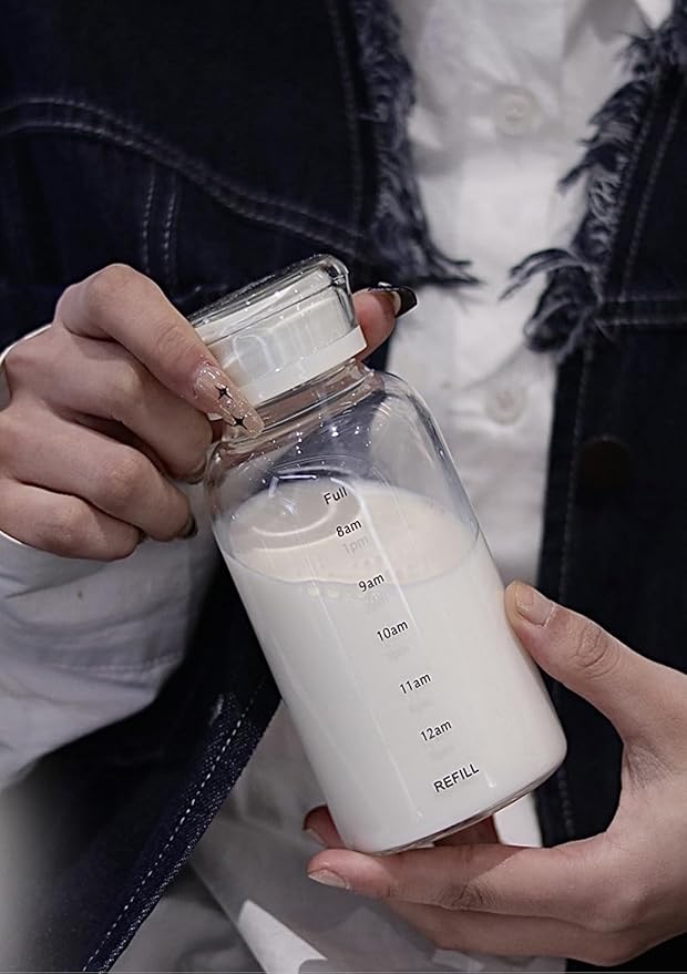 - Glass Water Bottle With Lid and Straw: The attractive time bottle features two convenient lids designed to meet all your daily needs. The straw lid allows easy sipping of beverages like milk and juices, while the leak-proof circular lid ensures safe portability, making it ideal for carrying in your bag without spills. Additionally, the time marker on the bottle empowers you to stay on track with your hydration goals throughout the day.