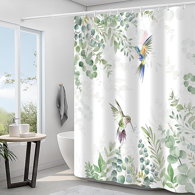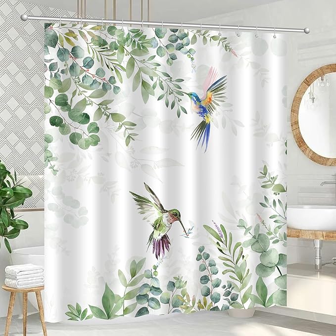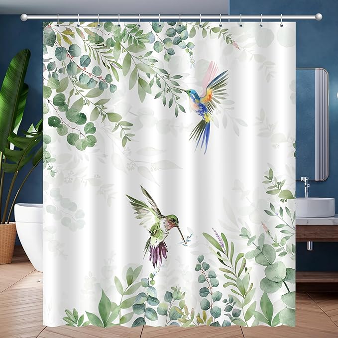 Hummingbird Sage Green Eucalyptus Leaves Shower Curtain, Spring Summer Botanical Floral Bird Home Bathroom Decor, Polyester Cotton Fabric Waterproof Modern Bath Curtain with 12 Hooks 60x72 Inches