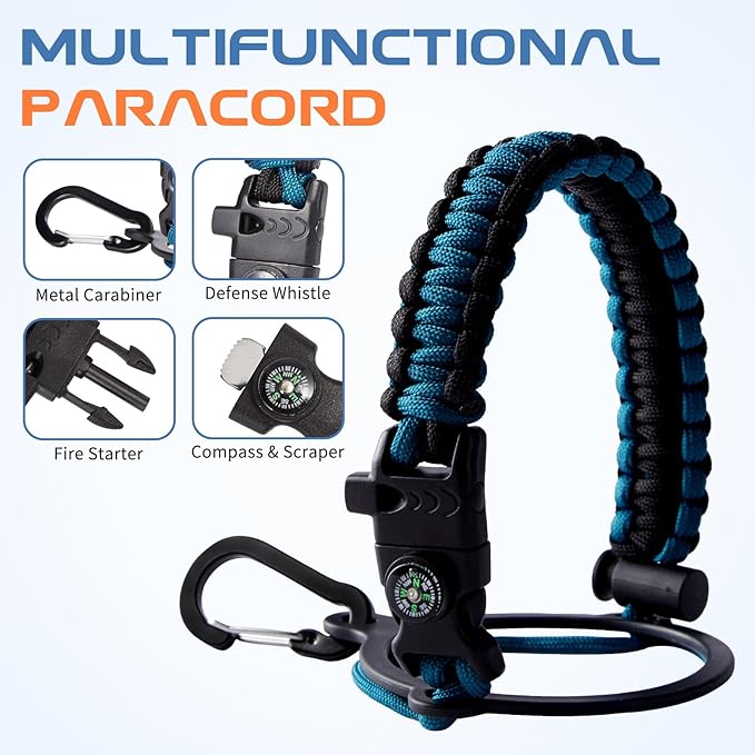 - PROTECTIVE BOOT & SURVIVAL PARACORD: Upgraded silicone boots prevent shattering and cracking when metal water bottle with straw accidental dropped. Humanized paracord handle for water bottles with compass, safety ring, carabiner, flint fire starter & whistle to be a perfect survival kit for adventure. Both design in individual styles to match the color of water jug, stylish and practical in your daily use