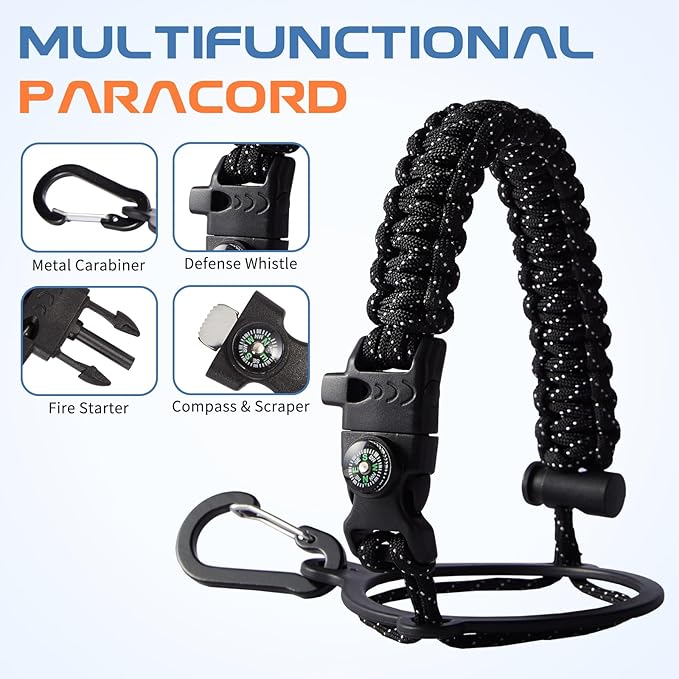- PROTECTIVE BOOT & SURVIVAL PARACORD: Upgraded silicone boots prevent shattering and cracking when 128 oz water bottle accidental dropped. Humanized paracord handle for water bottles with compass, safety ring, carabiner, flint fire starter & whistle to be a perfect survival kit for adventure. Both design in individual styles to match the color of water canteen, stylish and practical in your daily use