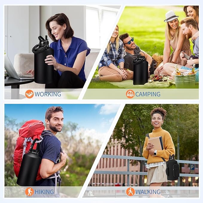 - SUPER VALUE COMBO: Buy 1 gallon water bottle, get 9 accessories (2 x lids, 1 x survival paracord, 1 x carrying pouch, 1 x shoulder strap, 1 x silicone boot, 2 x straws, 1 x straw cleaner). With the most complete bottle accessories, these thermal water bottles are perfect for daily use at home, work, school, gym, road trips, hiking, camping or just hanging out