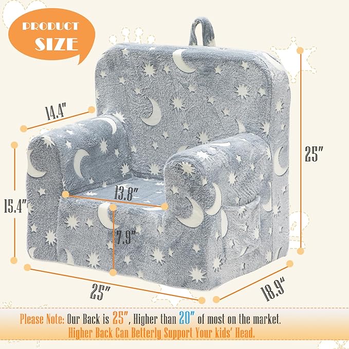 - ✿【GLOW IN THE DARK MOON TODDLER ARMCHAIR】➤ Expose SUFUS Glow in The Dark Toddler Chair Couch to a bright light or daylight, then turn off the lights at night and watch the magic happen! The glow light can create a dreamy atmosphere in your bedroom, as if you were floating in the universe and surrounded by the stars and moons, How incredible and amazing!