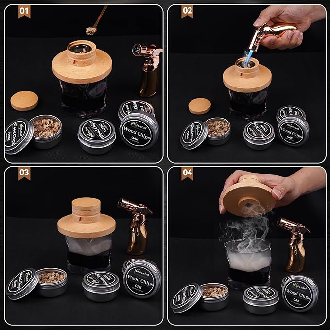 Cocktail Smoker Kit with Torch,High-End Set Old Fashioned Cocktail Kit for Whiskey with Wooden Box for Storage,4 Flavors of,Unique Gift for Men, Fathers,Friends and Elders. (No Butane)
