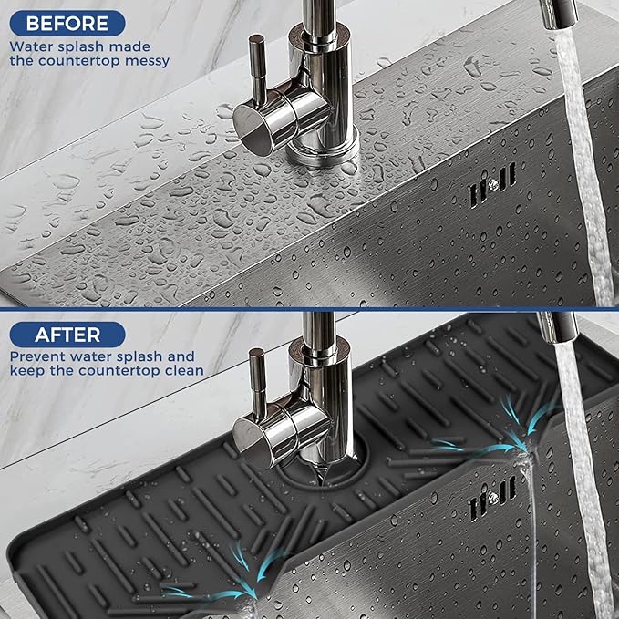 - đȘă5° UPGRADE VERSIONă Silicone sink faucet mat with upgraded 5° slope design and upgraded 0.79" (2 cm) thickness, the kitchen faucet splash guard allows captured water to flow into the sink faster, resulting in faster drying of the kitchen sink. This means never gets soggy, or not having any water spots by the sink faucet. You don't need to worry about the water staying on the sink & bathroom counter. Upgrading your kitchen sink & bathroom countertop in an effort-saving way!