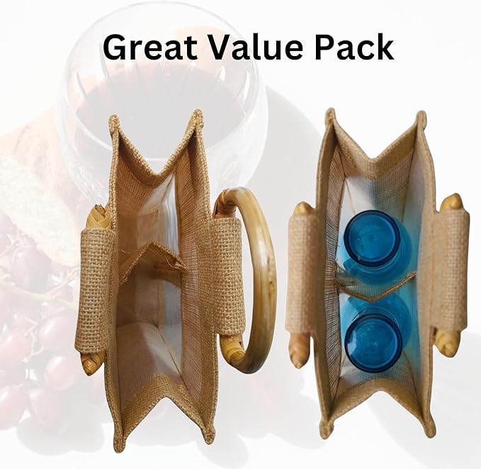 - The Handmade Jute Bottle Bag Gift is ideal for celebrations of all kinds, from anniversaries to wine tasting parties. This stylish jute wine bag makes an impressive gift for yourself or someone special. With extra-durable jute fabric and intricate window Bulap designs, the gift bags will bring a touch of sophistication to any gathering.