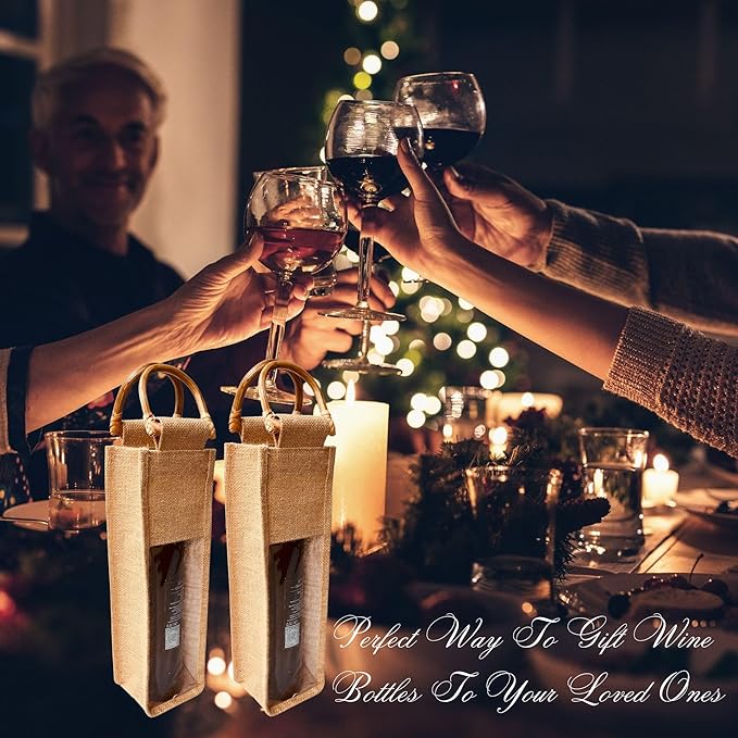 - This elegant jute wine gift bags ensures a sophisticated air at any gathering, from weddings to holiday parties. The durable jute material is perfect for wine storage and carrying, while the window Bulap design adds an extra layer of style.