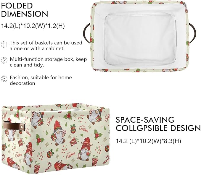 Merry Christmas Gnomes Storage Basket Fabric Kitchen Baskets Winter Candy Cane Bells Xmas Open Home Storage Bins Boxes Foldable Organizer Bag for Toy Book Shelf Closet Baskets 16×12×8 Inches