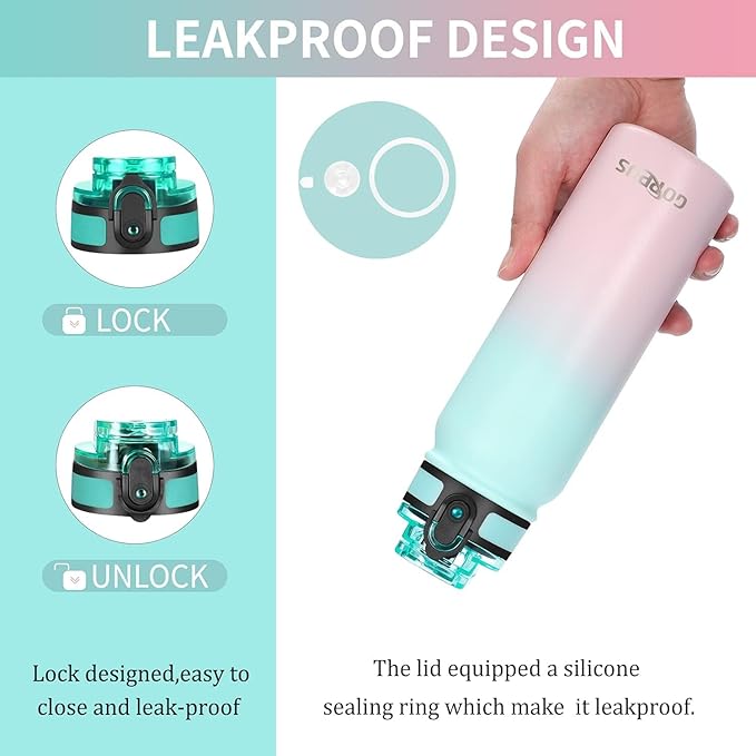 GOPPUS 20 oz Kids Water Bottle with Straw Wide Mouth Lid Leak Proof Double Walled Insulated Stainless Steel Water Bottles with Strap Handle for Boys Girls School (Green Pink 1 Lid)