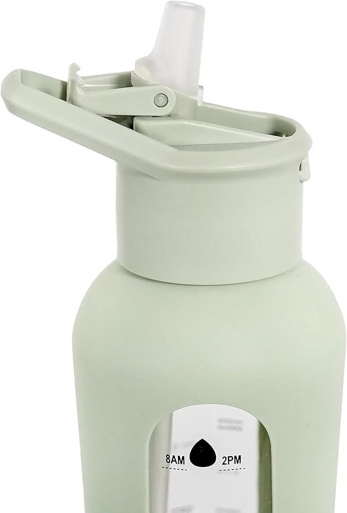 24oz Glass Motivational Water Bottle with Flip Lid Straw, Silicone Protective Sleeve, Handle, Reusable BPA Free (Sage Green)