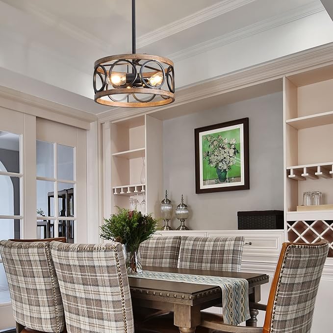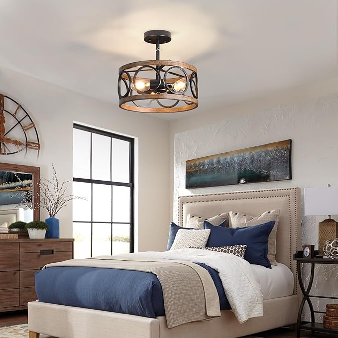 - 𝗨𝗡𝗜𝗤𝗨𝗘 𝗗𝗘𝗦𝗜𝗚𝗡: the farmhouse drum flush mount ceiling light fixture is beautifully designed with antique wood texture and matte black finish, adding a rustic style to your room. the open drum design, which not only improves the lighting, but also adds soft atmosphere
