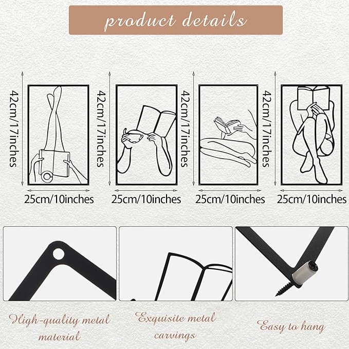 - Metal Minimalist Abstract Woman Wall Art: what you will receive are 4 pieces of single line female home hanging wall arts in gold color without frames, equipped with 8 pieces of screws, which can meet your daily decoration needs, and you can decorate them together or separately to add more elegance to your space