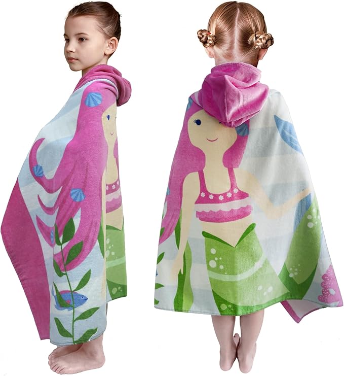 Kids Bath Towel Hooded - Cotton Kids Beach Towel 30"x50" for Ages 3 to 10, Toddler Towels with Hood Snaps, Soft Terry Poncho Towel as Pool Swim Cover Ups for Girls Boys (Mermaid Pink)