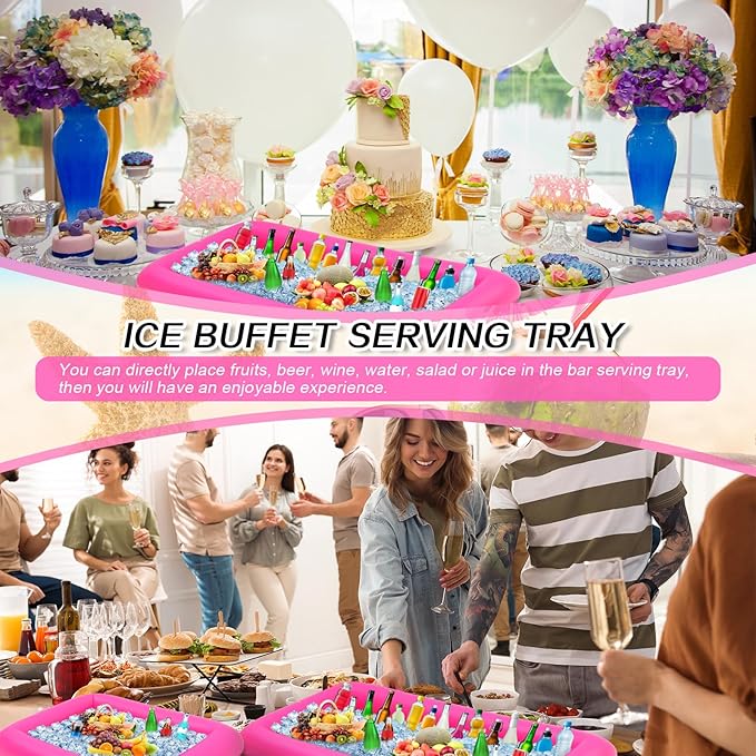 Leitee 4 Pcs Inflatable Ice Serving Bars Buffet Serving Tray Drink Cooler for Pool Party Inflatable Ice Tray Floating Food Drink Containers with Drain Plug and a Hand Pump, 2 Sizes (Pink)