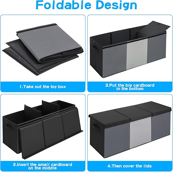 - Easy to assemble and fold: When not in use, the storage box can save space, able to be placed under the bed, in drawer, behind door or on shelf after folded; when in use, the internal space can be changed freely between one box, two boxes, and three boxes, convenient for storing various sizes of toys.