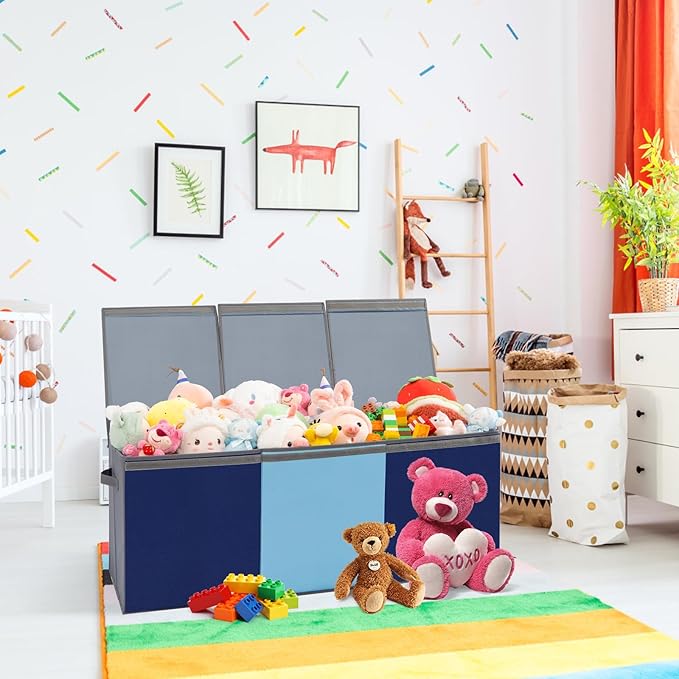 - Easy to assemble and fold: When not in use, the storage box can save space, able to be placed under the bed, in drawer, behind door or on shelf after folded; when in use, the internal space can be changed freely between one box, two boxes, and three boxes, convenient for storing various sizes of toys.