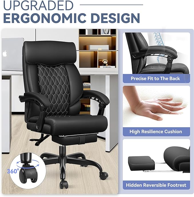- Multi-Functional Adjustment: The big and tall office chair allows you to adjust the seat height to suit your needs at any time. Reclining office chair with retractable footrests allows you to adjust a comfortable position to your personal preference. Experience the comfort and flexibility with the reclining office chair, easily switch between office mode and nap mode;