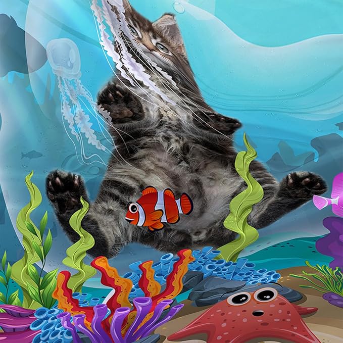 AILONEN Funny Cat Shower Curtain for Bathroom, Ocean Animal Print Shower Curtain, 60" W*72" H Waterproof Polyester Cat Lover Shower Curtain Decor Bathroom with Grommets and Hooks