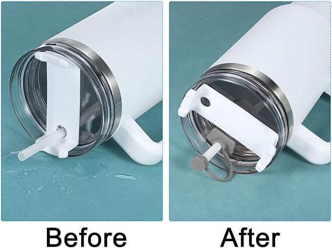 - Advantage: The spill stopper is made of silicone material, which is flexible, durable and convenient to clean. The straw cap can prevent water from spilling out of the straw and keep dust out. The round stopper is installed on the inner side of the cup lid, which ensures sealing while allowing air to enter for easy drinking. The square stopper is installed on the outer side of the cup lid, securing the straw in place and forming a seal to prevent leak.