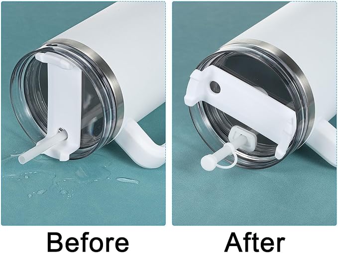 - Advantage: The spill stopper is made of silicone material, which is flexible, durable and convenient to clean. The straw cap can prevent water from spilling out of the straw and keep dust out. The round stopper is installed on the inner side of the cup lid, featuring a cross-shaped opening design that ensures sealing while allowing air to enter for easy drinking. The square stopper is installed on the outer side of the cup lid, securing the straw in place and forming a seal to prevent leak.