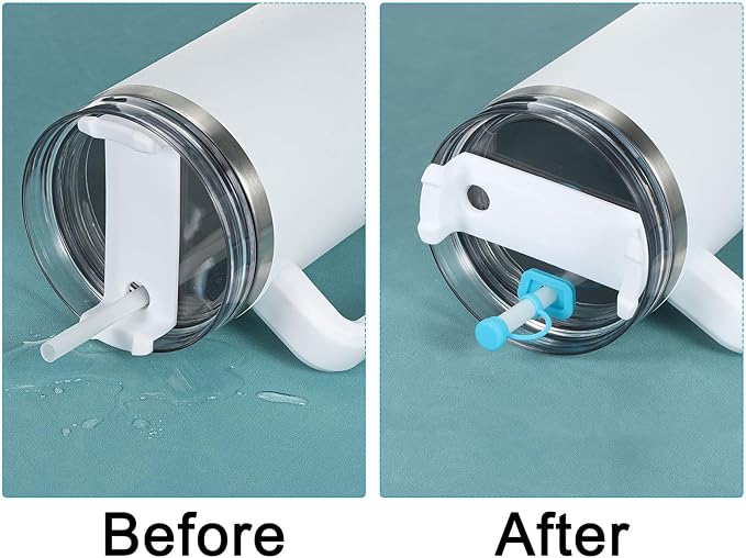 - Advantage: The spill stopper is made of silicone material, which is flexible, durable and convenient to clean. The straw cap can prevent water from spilling out of the straw and keep dust out. The round stopper is installed on the inner side of the cup lid, featuring a cross-shaped opening design that ensures sealing while allowing air to enter for easy drinking. The square stopper is installed on the outer side of the cup lid, securing the straw in place and forming a seal to prevent leak.