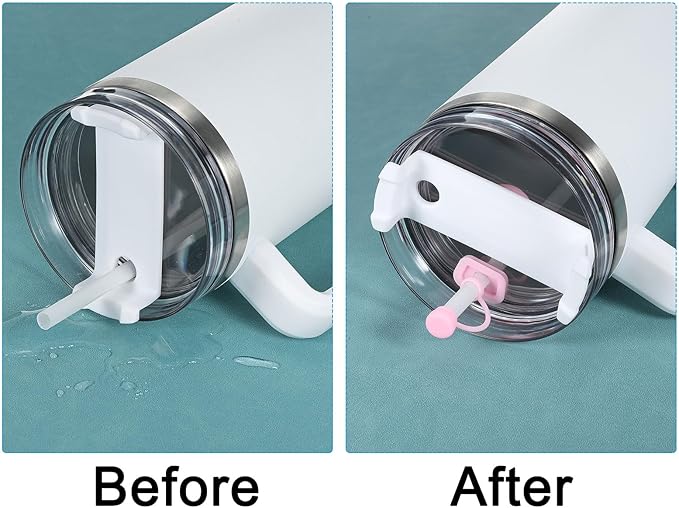 - Advantage: The spill stopper is made of silicone material, which is flexible, durable and convenient to clean. The straw cap can prevent water from spilling out of the straw and keep dust out. The round stopper is installed on the inner side of the cup lid, featuring a cross-shaped opening design that ensures sealing while allowing air to enter for easy drinking. The square stopper is installed on the outer side of the cup lid, securing the straw in place and forming a seal to prevent leak.