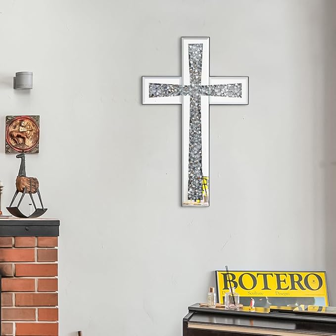 - Material: Polished silver mirror with acrylic diamond decoration. This mirrored cross is constructed by MDF wood back for reinforcement and stability.