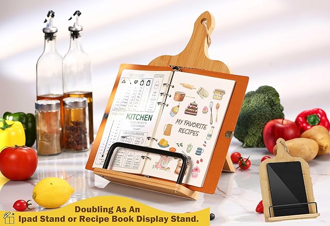 - Multi-Function Stand: The cookbook holder is ideal for keeping your hands free while following recipes on your cookbook, magazine, or iPad; With a sturdy kickstand, easily support a thicker cookbook in your kitchen, the bar, or any other desktop; Design with a hole and jute lanyard in the handle, you can hang it up as a home decor when it is not in use