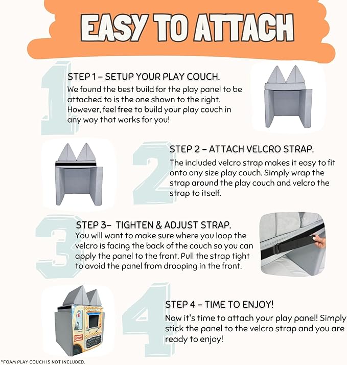 - EASY SETUP - Our play panels are able to be set up and swapped out in seconds! All you need to do is wrap the velcro strap around the couch and you are ready to go! Your panel will attach in seconds. Want to change the scenery? Buy multiple panels to change things up for your kids!
