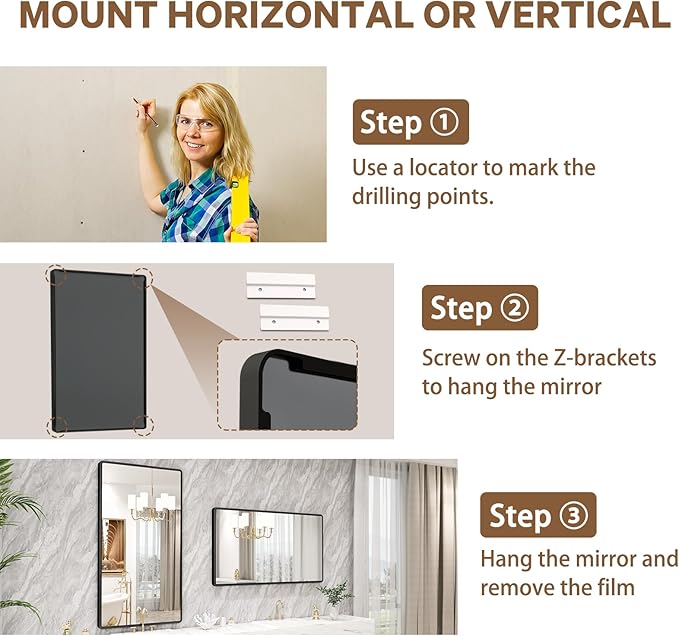 - 【Easy Sturdy Installation】The bathroom mirror with hanging design on the frame back to hang horizontally or vertically. Super easy to install with Z-bar sturdy wall bracket, ensures the mirror rests more securely against the wall. (Hardware included);