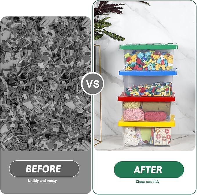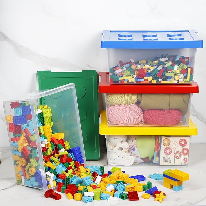 - ❤PERFECT DESIGN - Our toy storage bins are designed with compatible building base plates and lids. You can stack boxes of the same size like building blocks without sliding. Each lid is fastened tightly to the container through a snap design. The transparent container is clear at a glance, making it easy to distinguish different toys. Cultivate the habit of storing babies from an early age.
